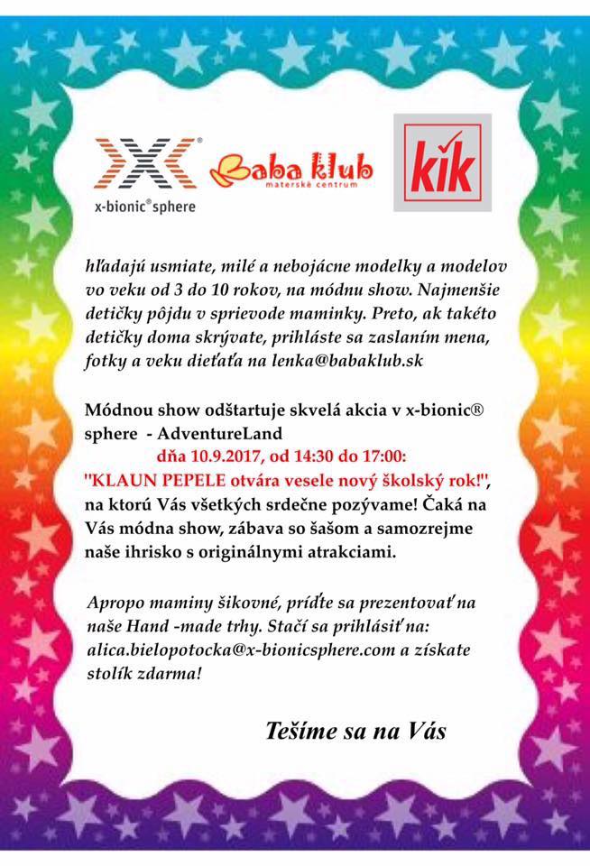 Pozor, od stredy 30. 08. do nedele 03. 09. si mozete ist vybrat do predajne Kik v Samorine oblecenie na modnu prehliadku. Staci povedat, ze idete na Modnu Show do X bionicu. V nedelu 3.9. O 10:00 prebehne skuska v X-bionic.